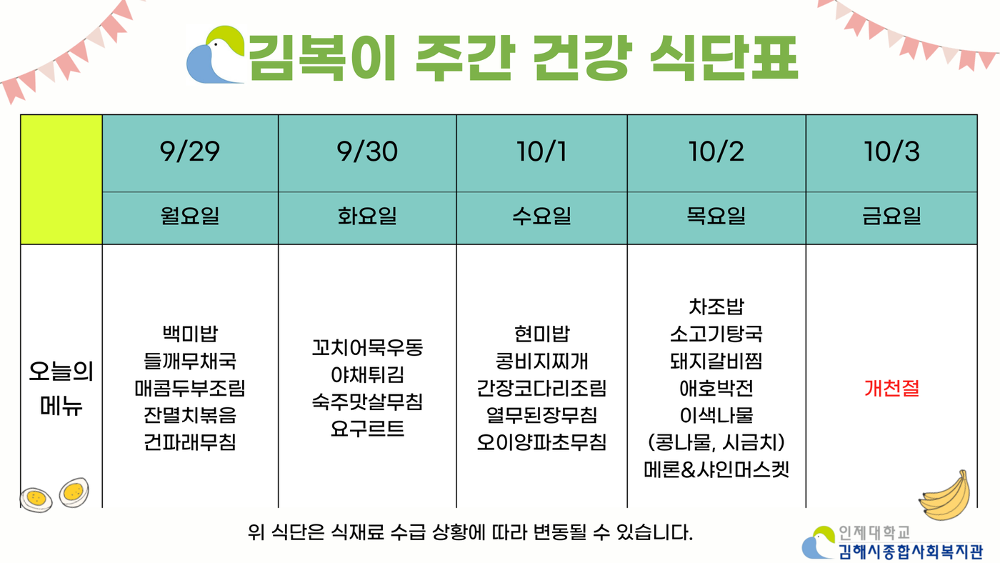 인제경로식당 2025년 9월 5주차(9/29~10/3) 식단
