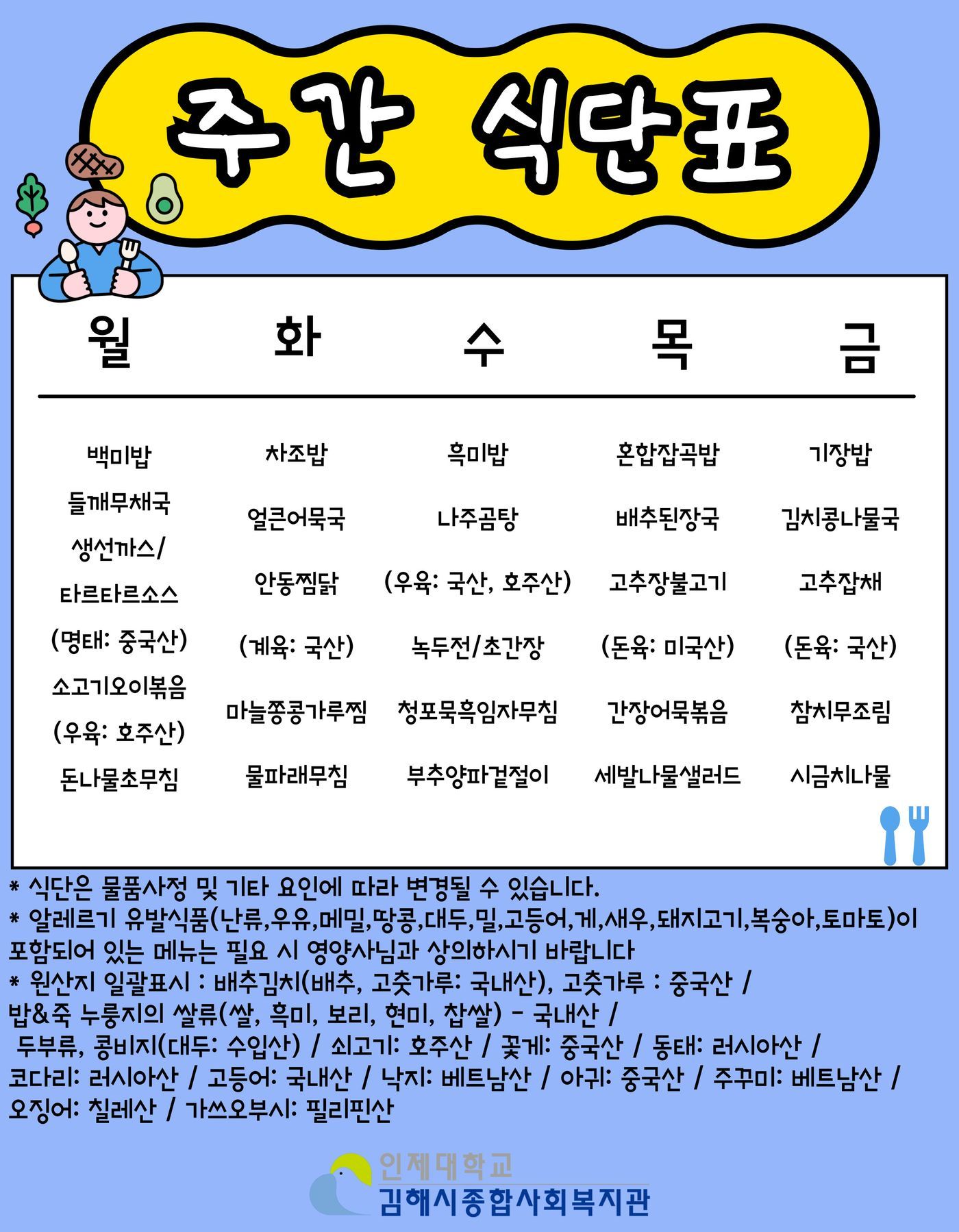 인제경로식당 2025년 12월 2주차(12/8~12/12) 식단