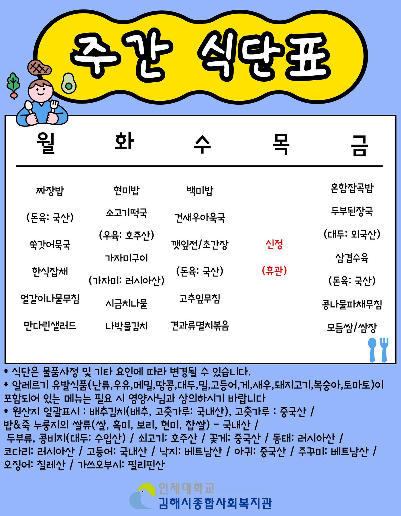 인제경로식당 2025년 12월 5주차(12/29~1/2) 식단