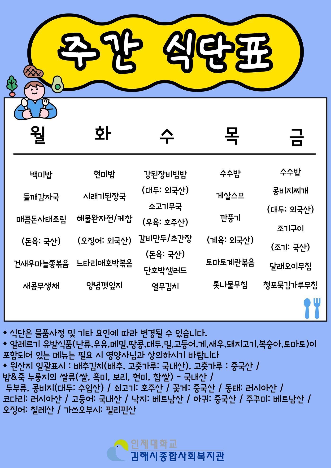 인제경로식당 2026년 2월 1주차(2/2~2/6) 식단