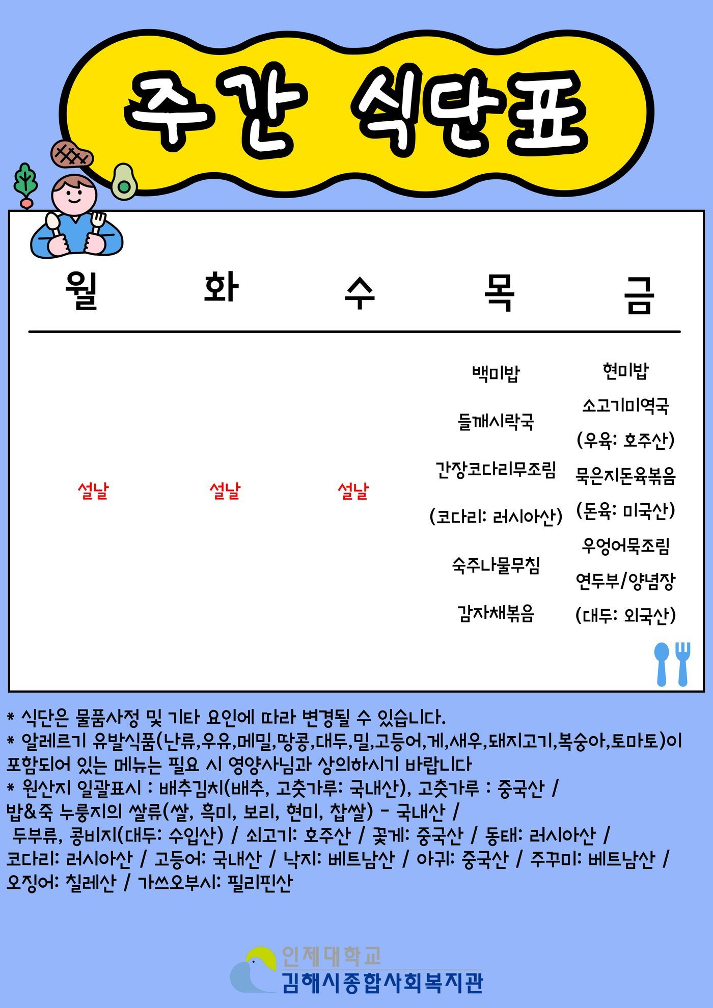 인제경로식당 2026년 2월 3주차(2/16~2/20) 식단