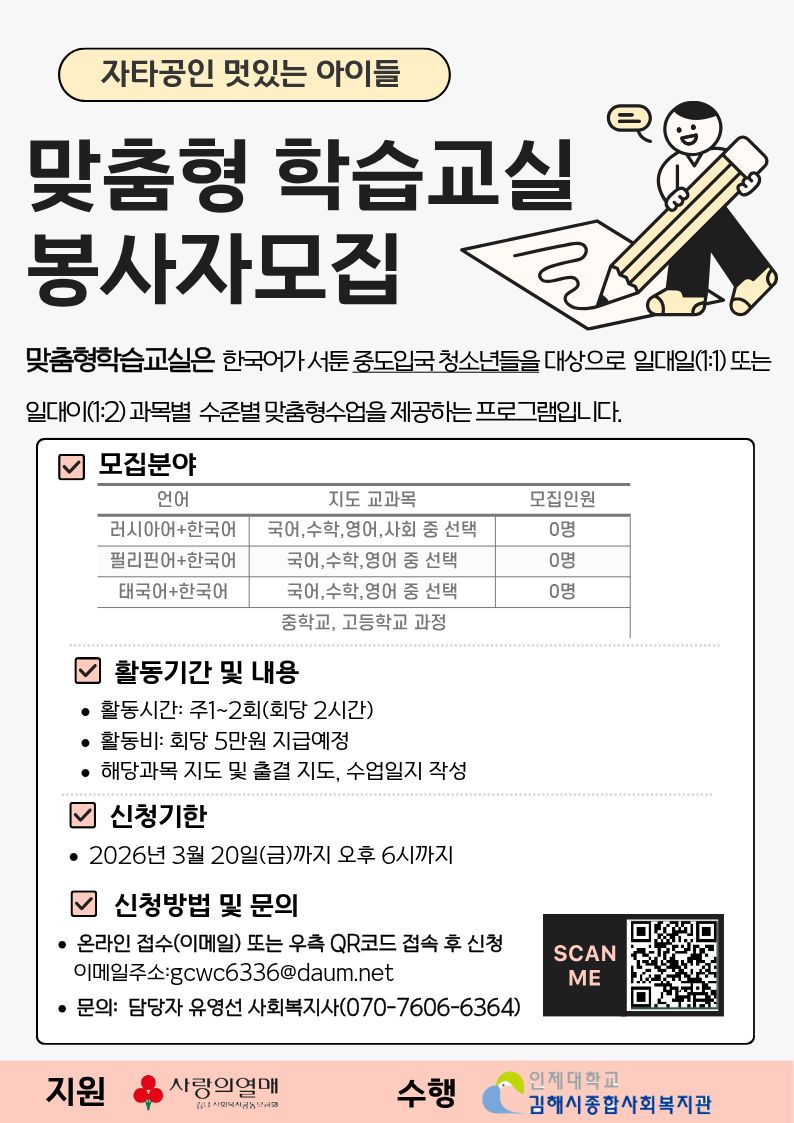 2026년 중도입국청소년 맞춤형학습교실 봉사자분들을 모집합니다.