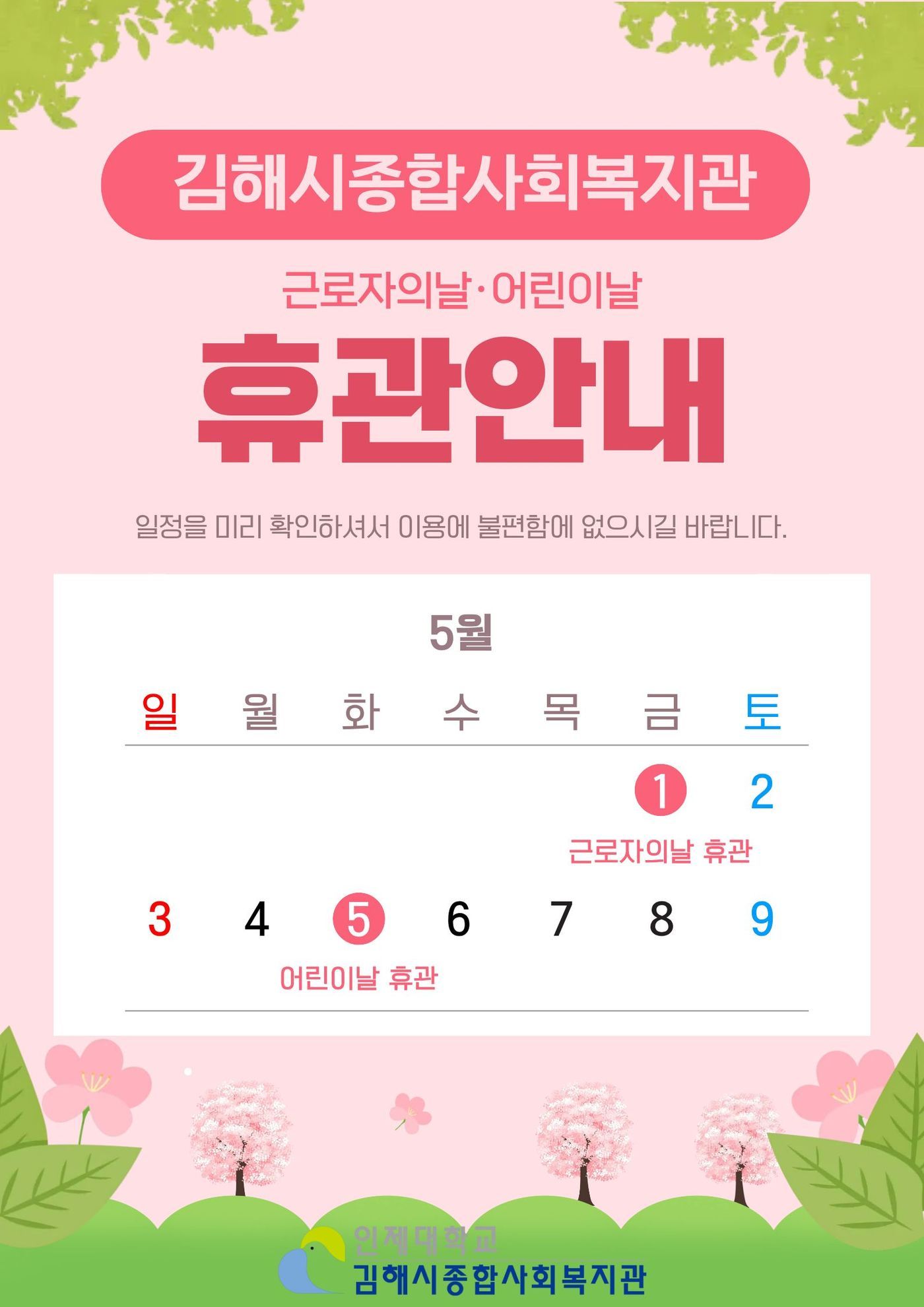 [공지] 근로자의날(5/1), 어린이날(5/5) 휴관 안내