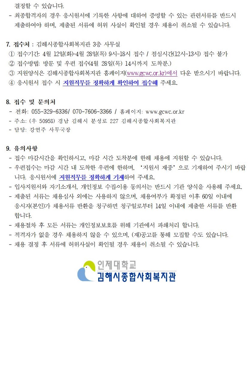 [채용공고] 김해시종합사회복지관 사무원 채용 공고