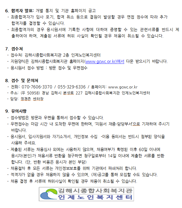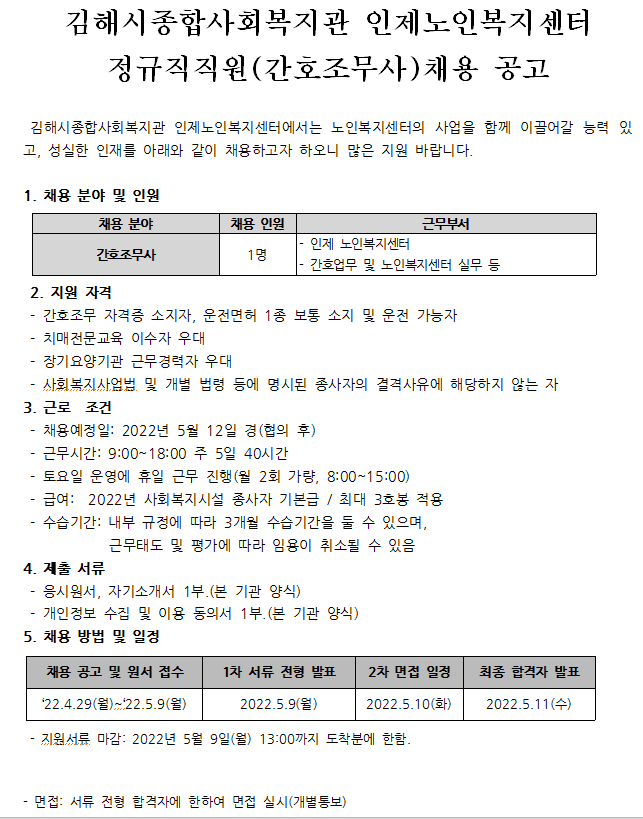 [채용공고] 김해시종합사회복지관 인제노인복지센터 정규직 직원(간호조무사) 채용 재공고