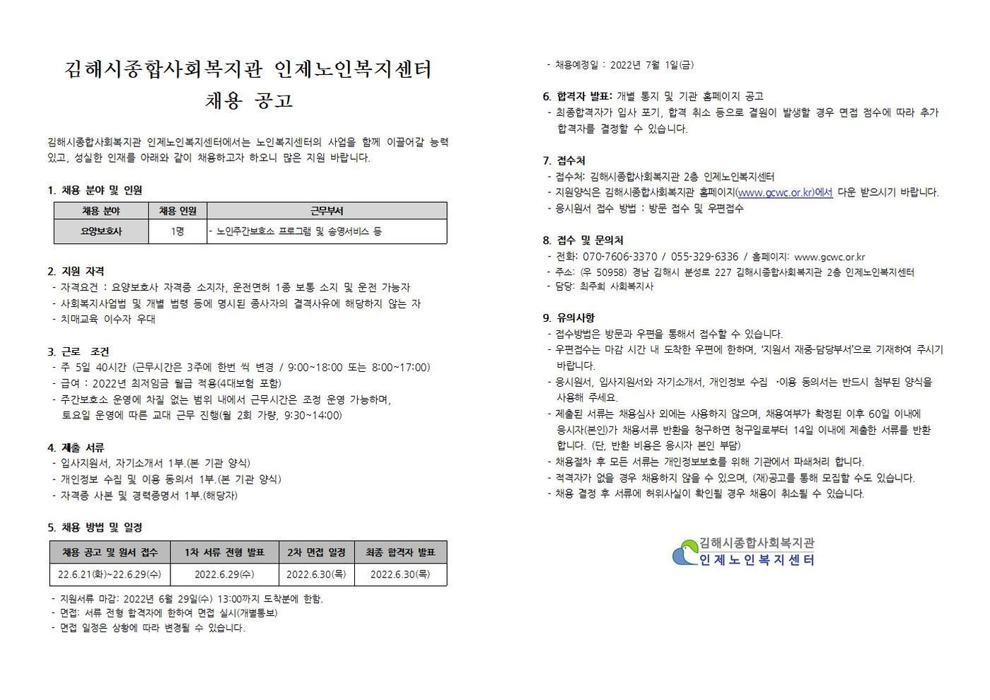 [채용공고] 김해시종합사회복지관 인제노인복지센터 직원채용(요양보호사) 공고