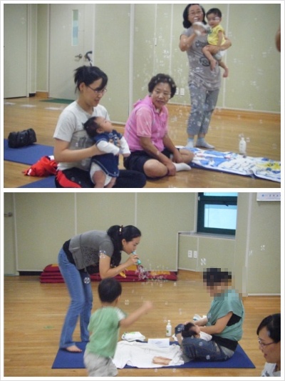 <쑥~쑥~! 쭉~쭉~! 동요에 맞춰 마사지 해요.> <방울방울 비눗방울이 봄비처럼 내립니다.>