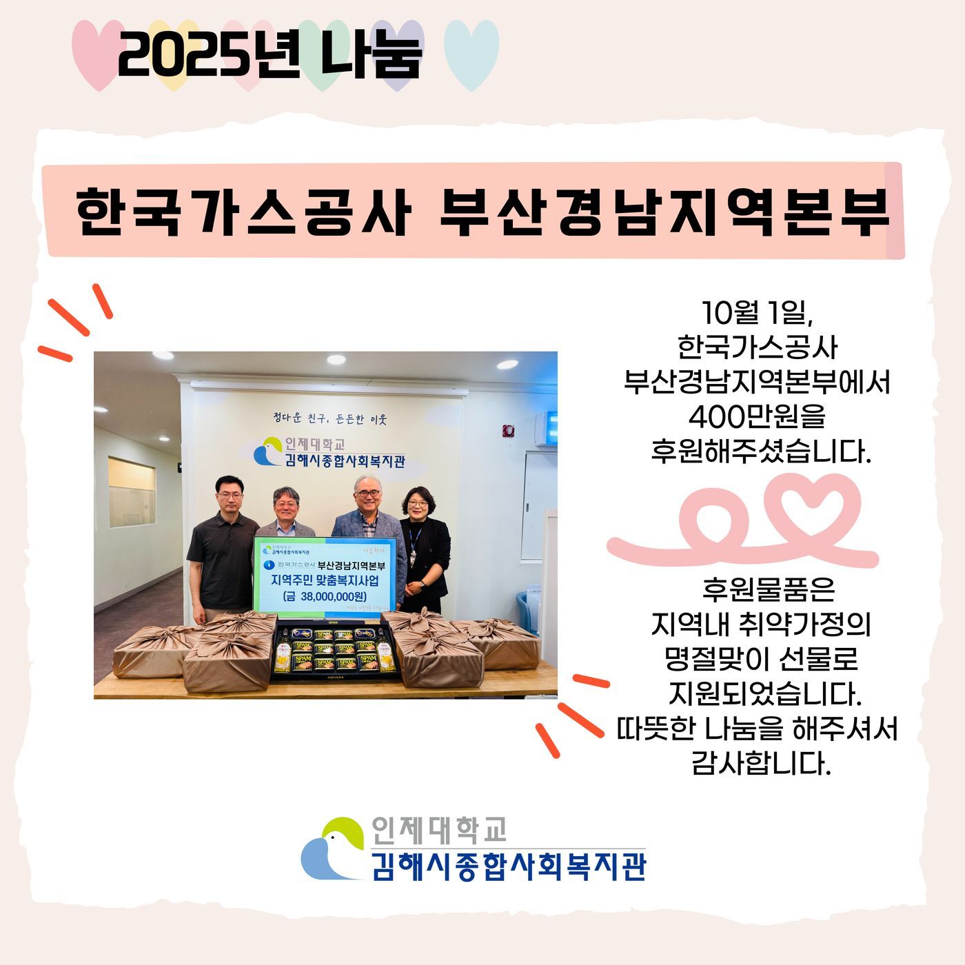 [따뜻한 나눔] 한국가스공사 부산경남지역본부 명절나기 지원금 후원