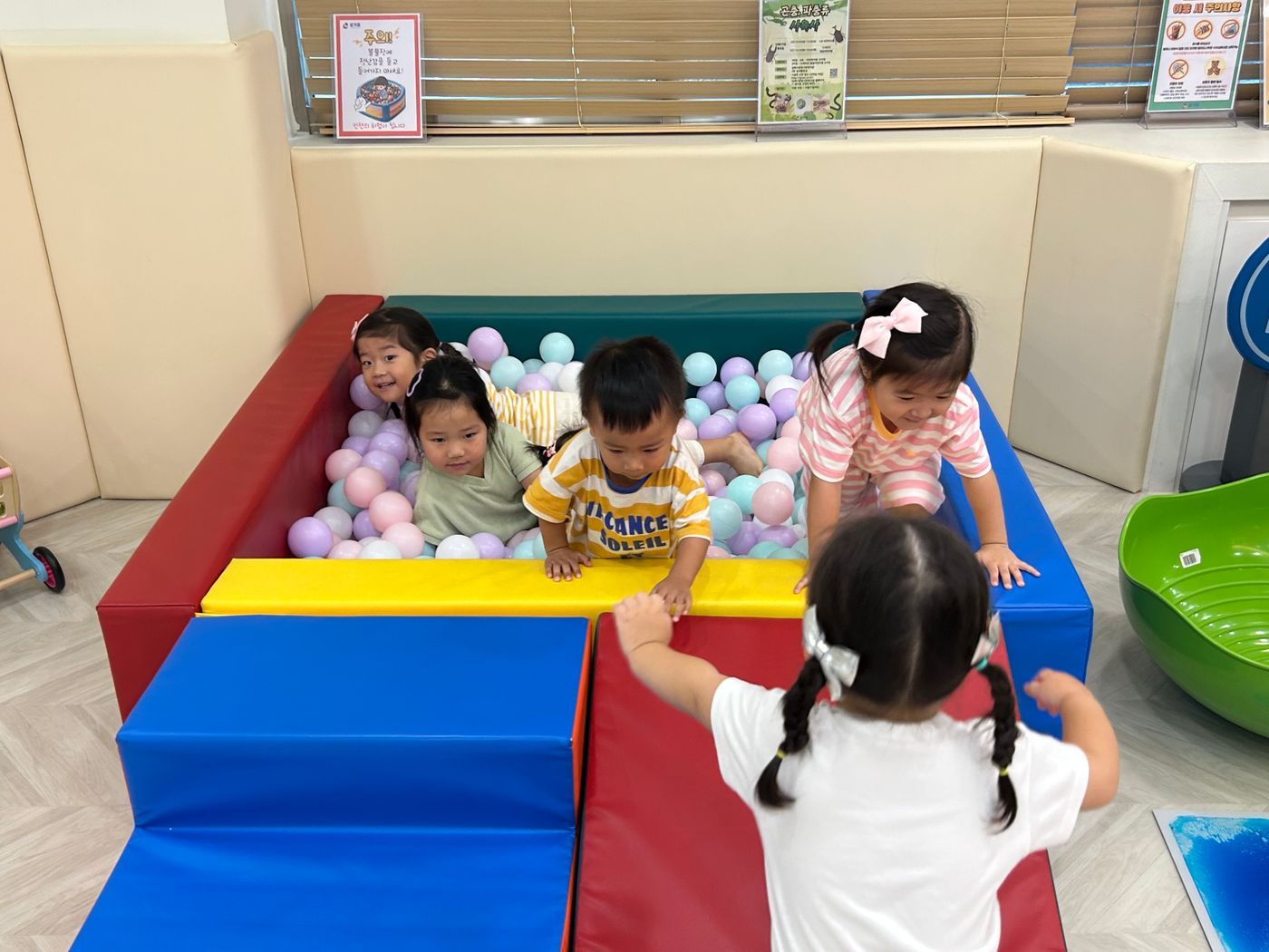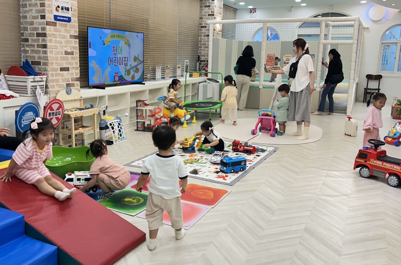 포크레인이나 자동차를 매트위로 가지고와 친구랑 붕붕 밀며 놀이하기도 하고 스프링카에 올라 몸을 흔들며 재미있게 놀이하기도 했어요.
