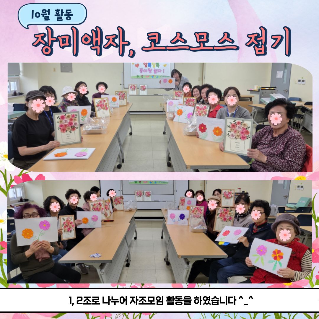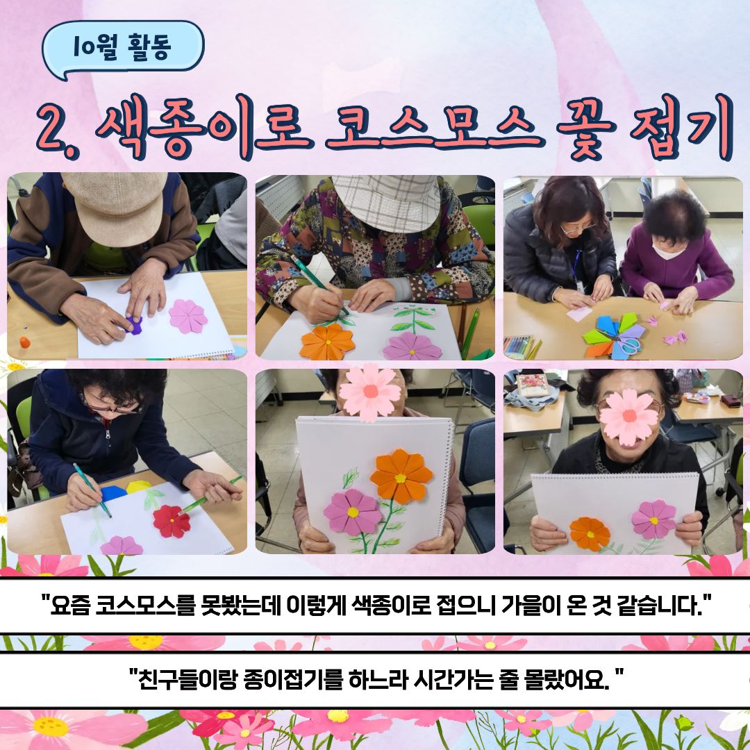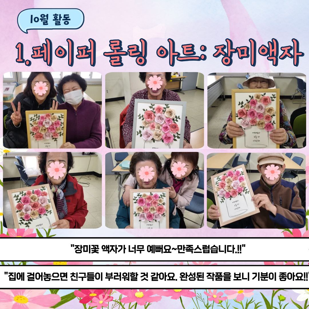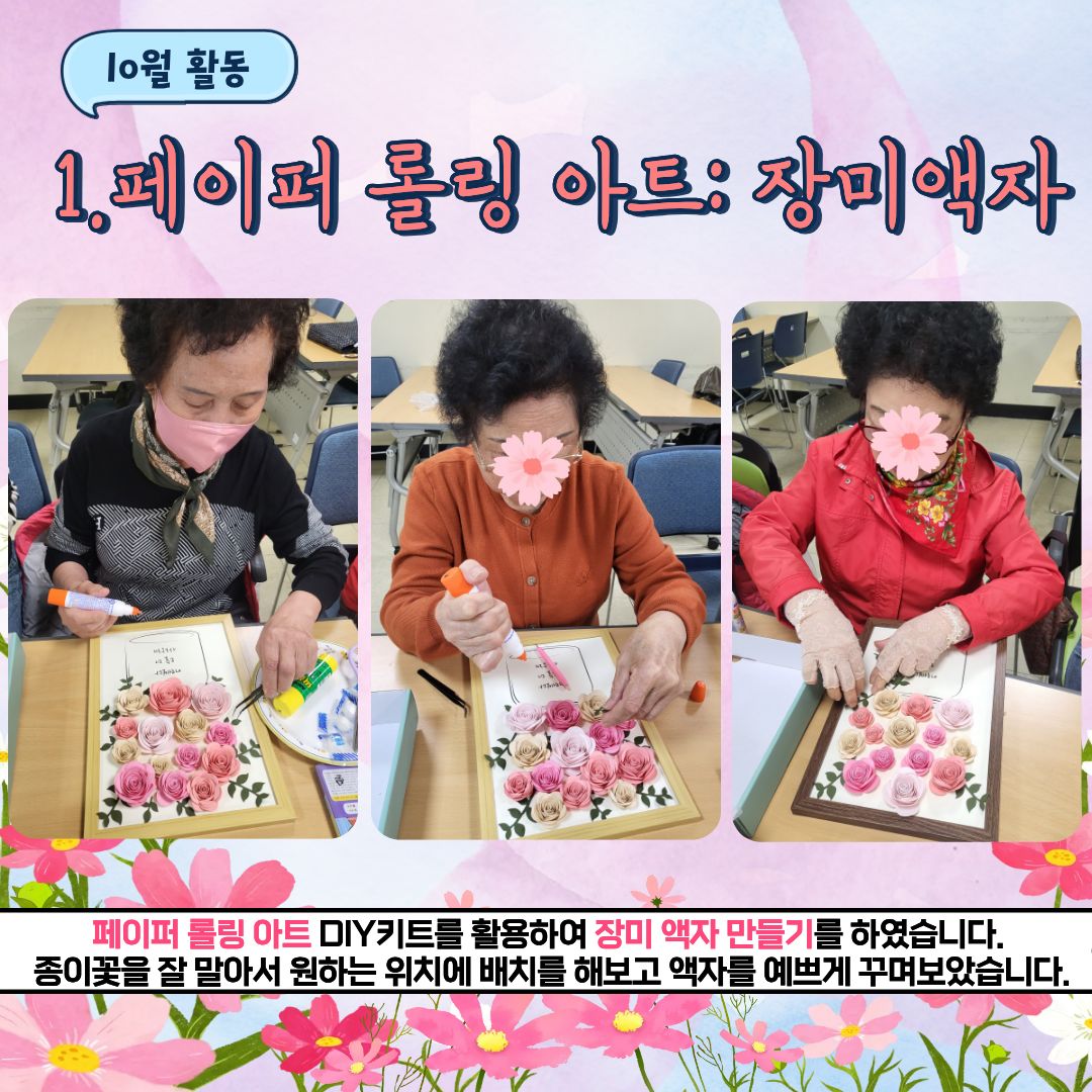 [노인맞춤돌봄서비스] 자조모임 "종이랑 놀자" 10월 활동 - "페이퍼 롤링 아트 장미꽃 액자, 색종이로 코스모스 접기