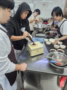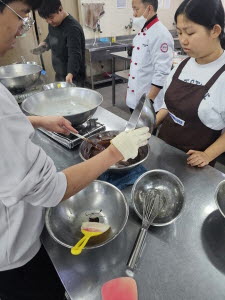 우선 요리학원에서는 마가린을 녹이고 초콜릿과 파우더 등 여러 재료를 조합해 브라우니를 만들고