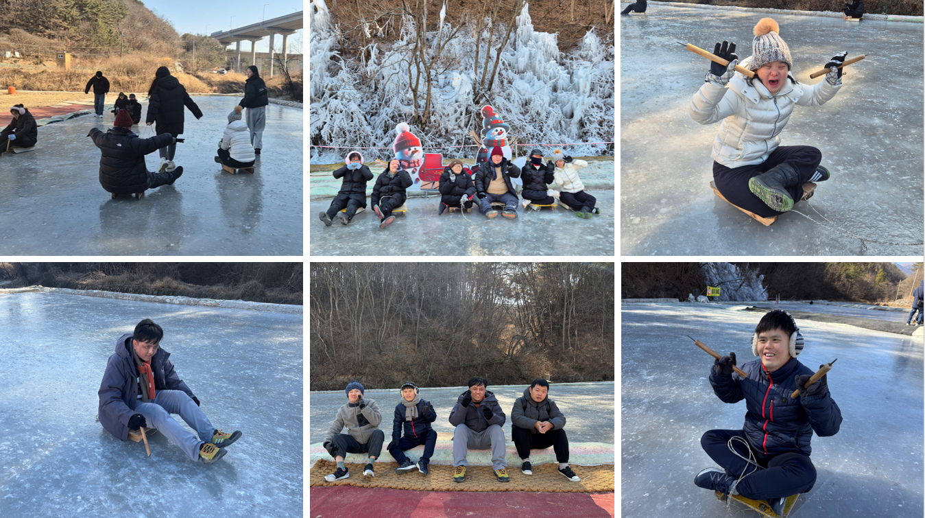 썰매장에 도착하자 넓게 펼쳐진 빙판길이 이용자들을 반겨주었고, 모두 썰매를 하나씩 들고 설레는 마음으로 체험을 시작했습니다!