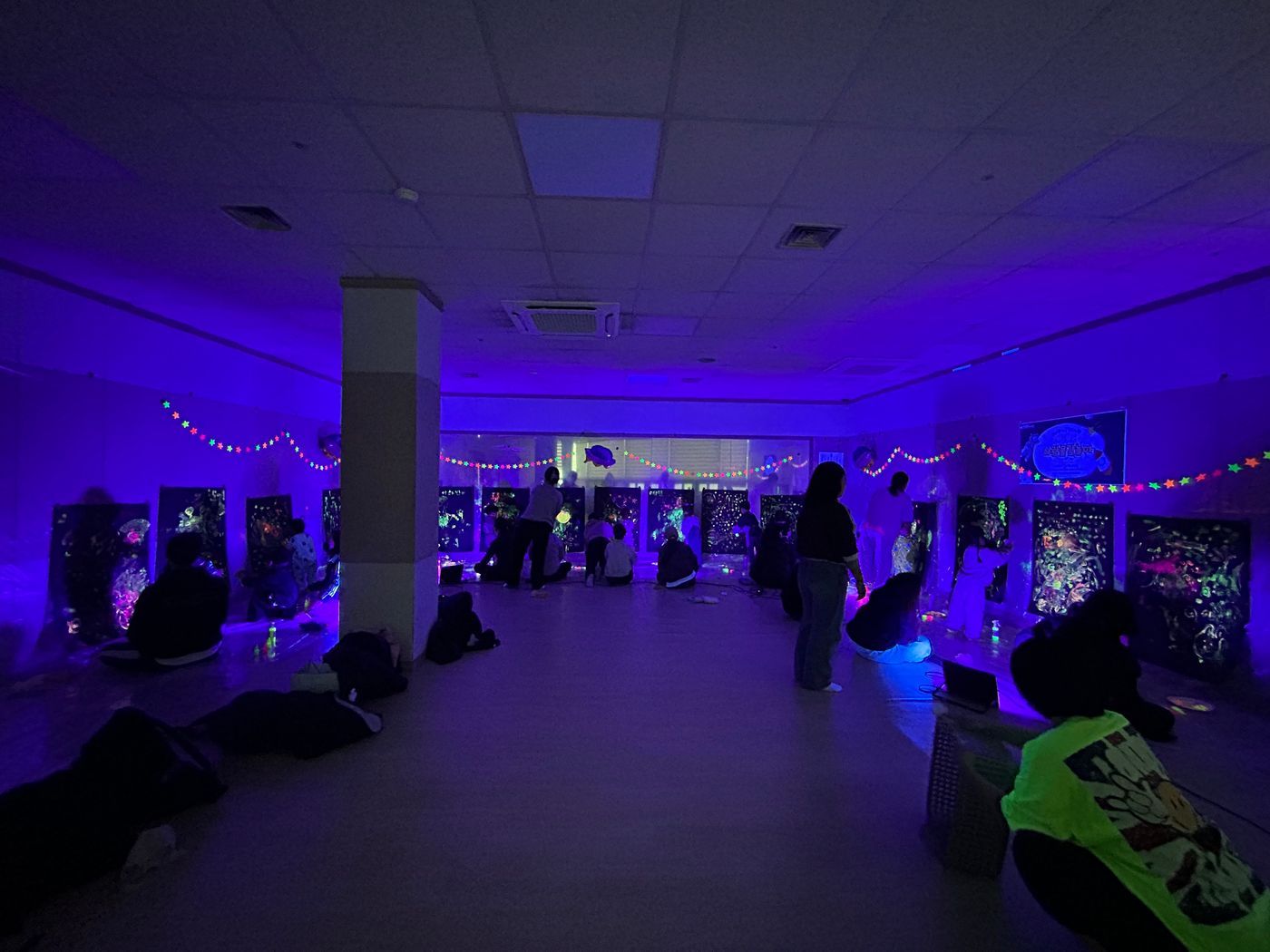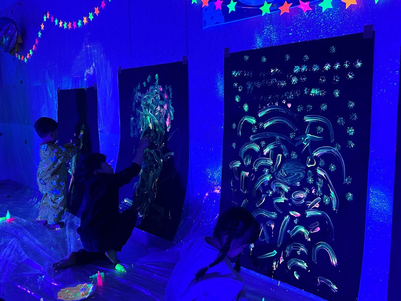 야광물감으로 우주를 표현하고 야광 스프레이를 뿌려 나만의 멋진 우주와 은하수, 별똥별을 표현하는 시간이었어요.