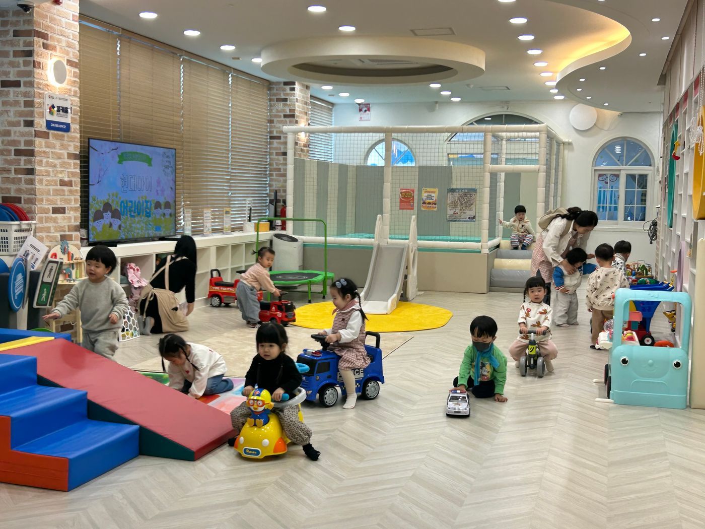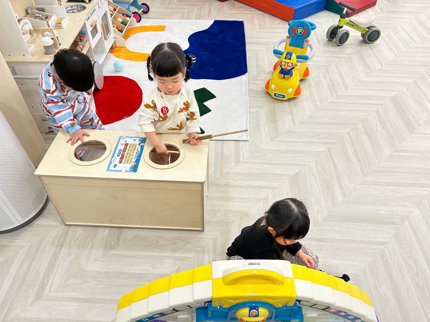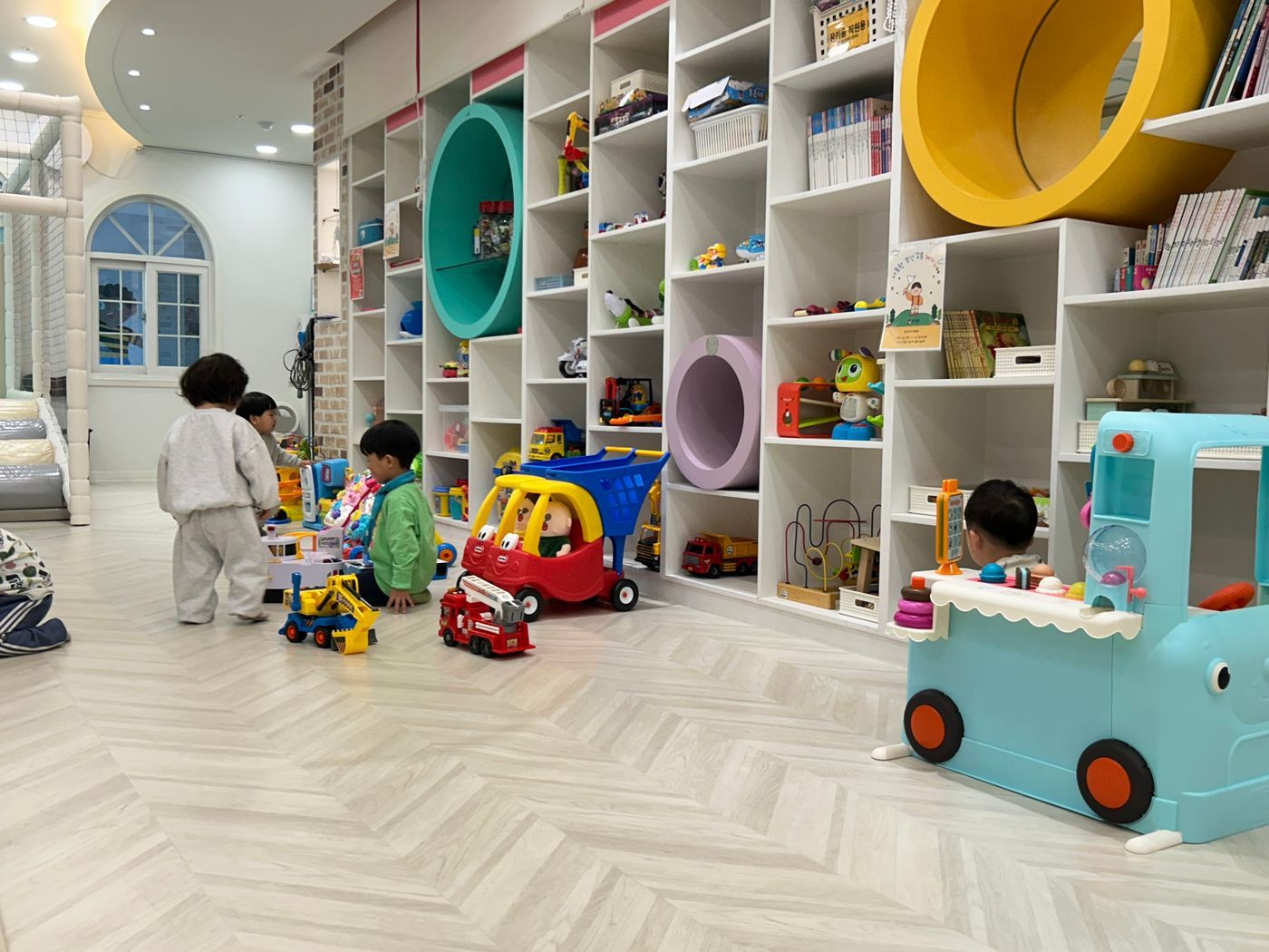 활기차게 놀잇감을 찾아 나선 친구들은 미끄럼틀을 타고 트렘펄린도 콩콩 뛰고 내가 잡은 물고기를 자랑하기도