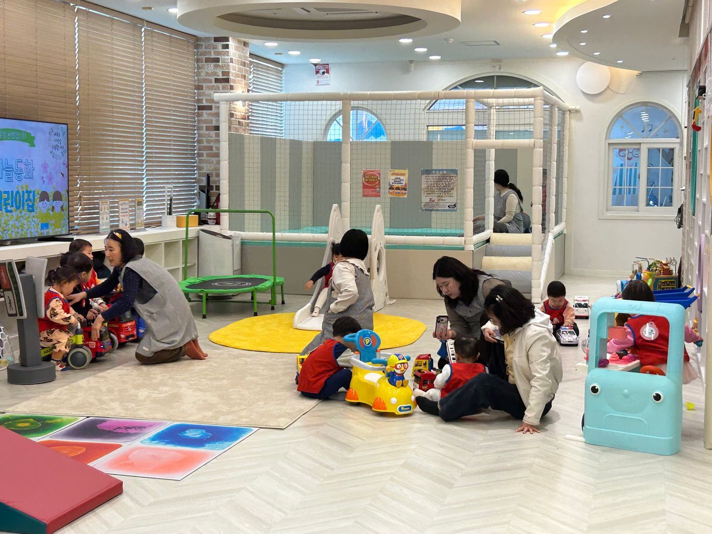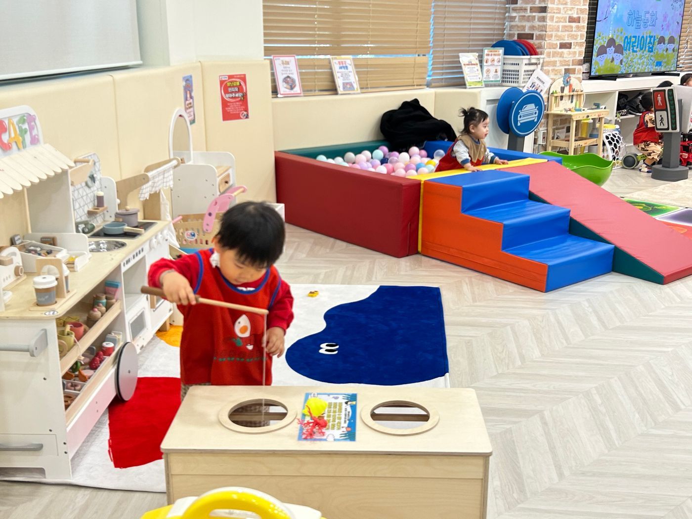 트렘펄린에서 콩콩 뛰고 꿈키움의 인기공간이 볼풍장에서 놀이하고 작은 구멍을 들여다보며