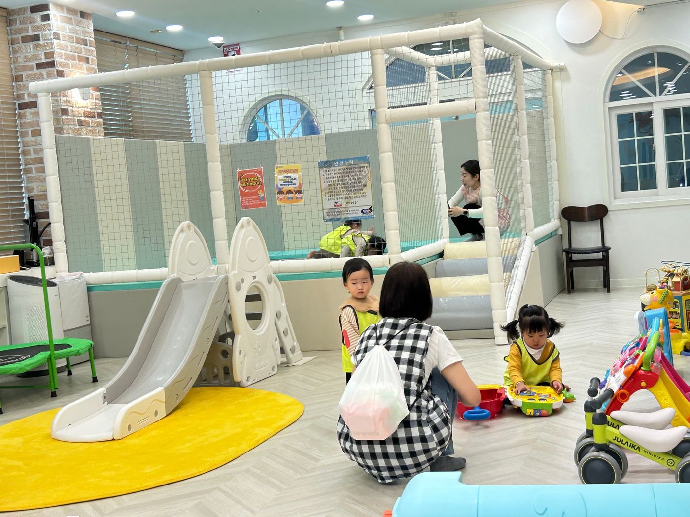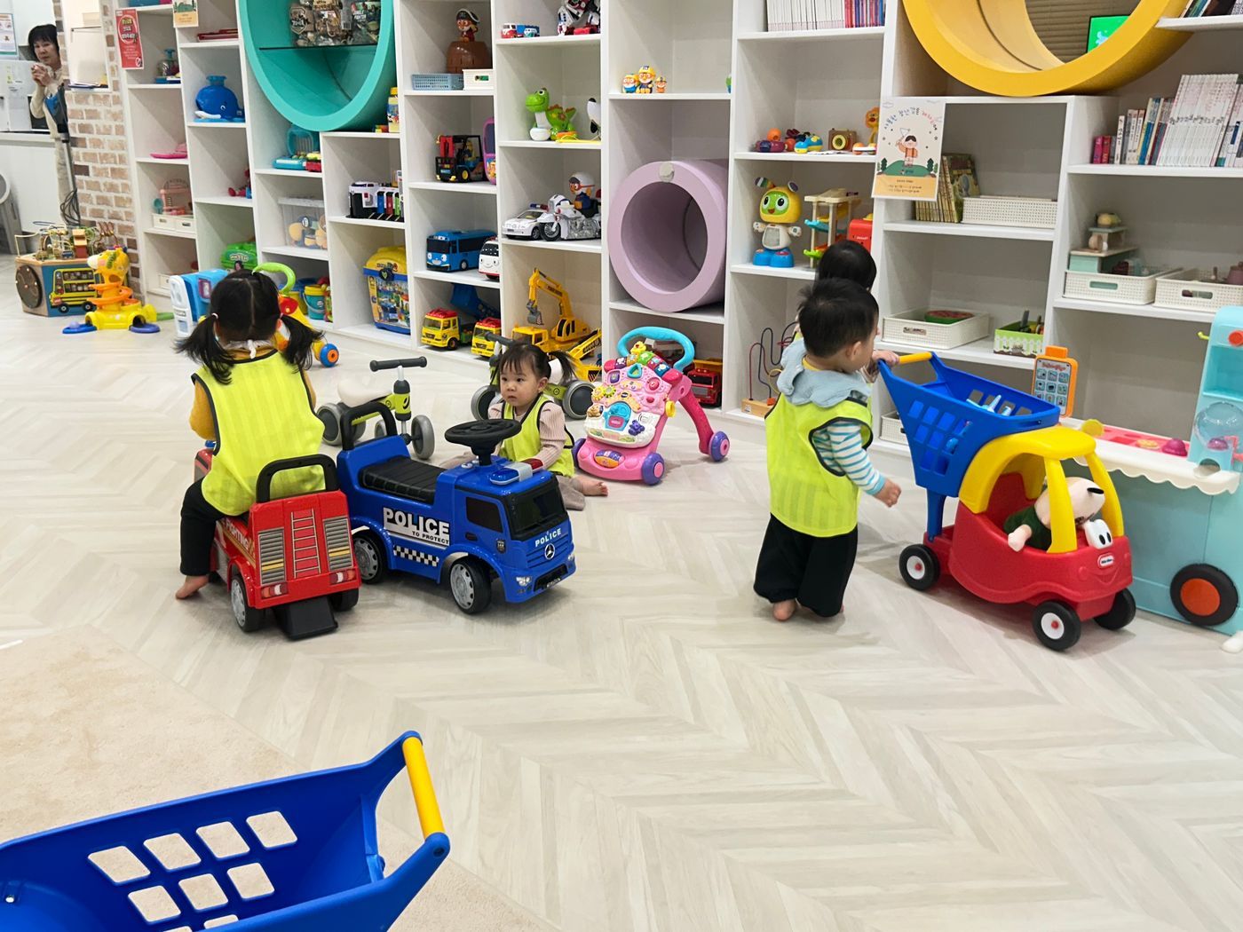 선생님이랑 친구들이랑 콩콩 트램펄린을 타고 카트에 물건을 넣어 끌고 다니고 붕붕 자동차도 타며
