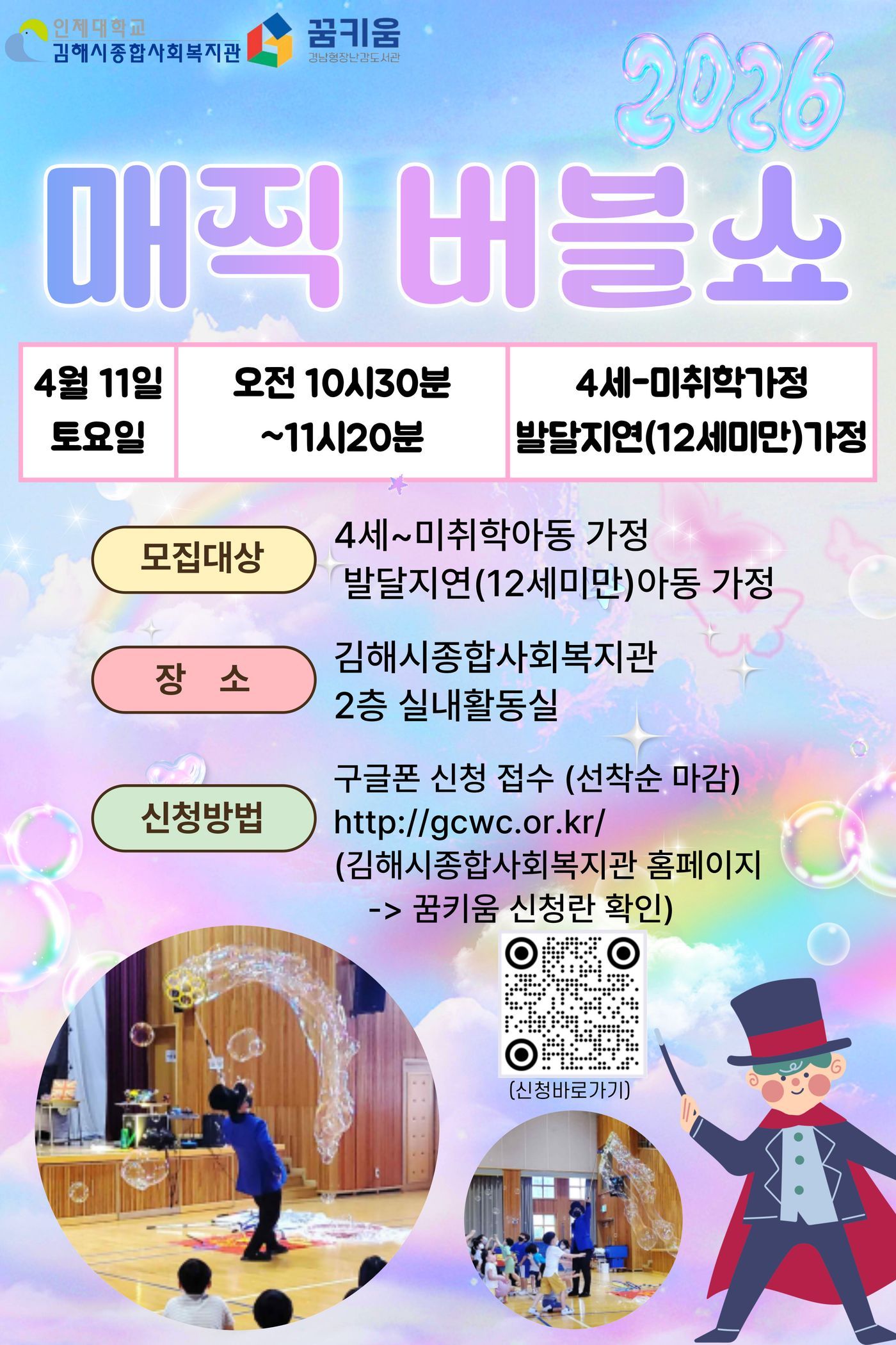 꿈키움이 '4월 매직 버블쇼' 프로그램 참여자를 모집합니다.